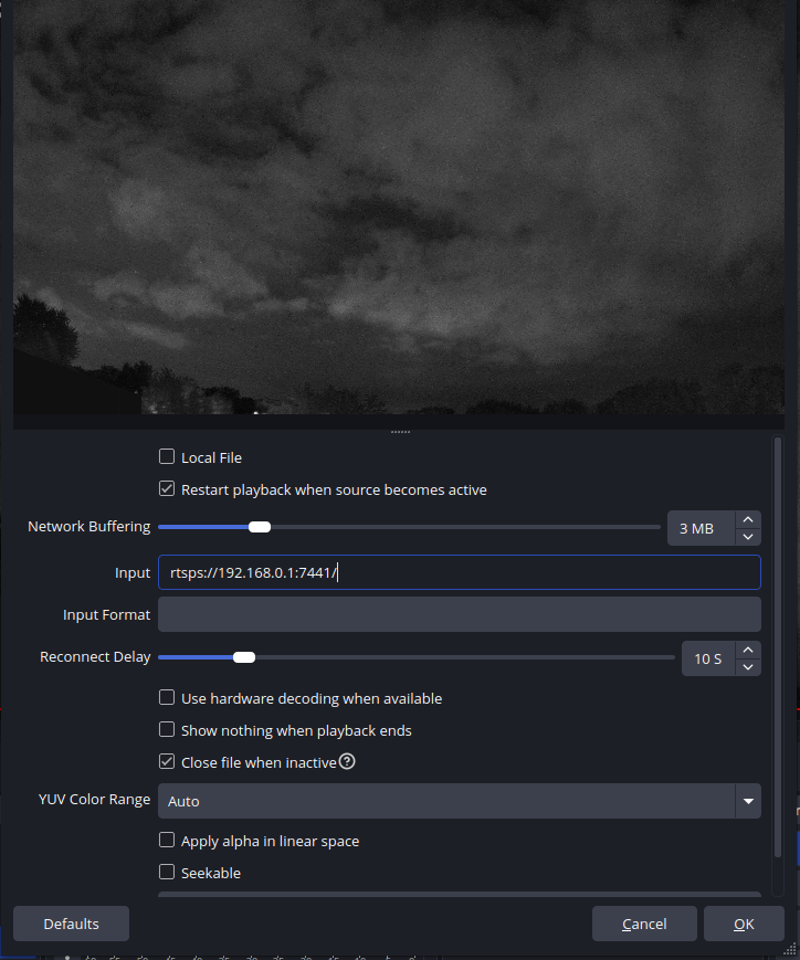Below is a screenshot of the setup for the Weather Camera. Start by adding a media source. In the Input box, add the full URL for your RTSP or RTSPS stream (this comes from your camera or NVR). For reliability, check the ‘Restart playback when source becomes active’ and ‘Close file when inactive’. These two settings will attempt to reconnect to your RTSP stream if an issue occurs.