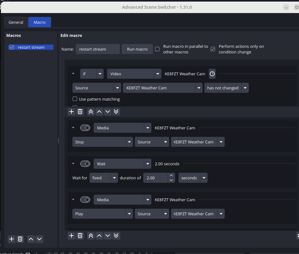 To resolve this issue, I used a tool called Advanced Scene Switcher. This tool allows you to create macros that run based on certain conditions. Below, I will walk through creating a macro to detect when the stream has frozen and restart it.