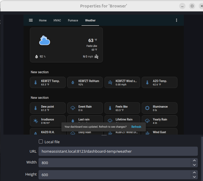 Next, I added an overlay of weather information to my stream. To do this, I added another source and chose Browser. I entered the URL for the dashboard in my Home Assistant software. I then resized the window and moved it to the corner.