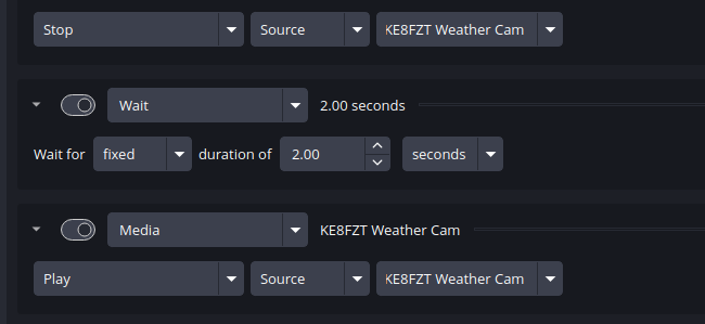 In the lower half of the screen, where we “define macro actions”, I have set up 3 actions. The first action stops the source of the camera. The section action pauses for 2 seconds. The final section then restarts the source.
